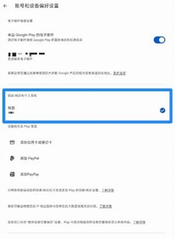 打开play商店-点击头像-设置-常规-账号和设备偏好设置-查看国家/地区和个人资料栏是否有韩国,如果有,账号就成功设置了韩区IP了